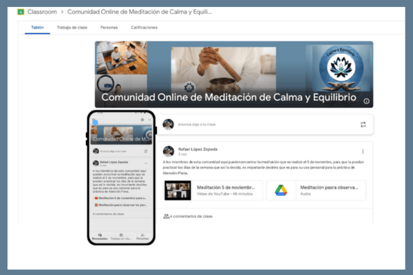 Se utilizará la plataforma Google Classroom que puedes ver en estas imágenes para alojar los videos de las meditaciones grabadas, mismas que se mantendrán durante una semana.